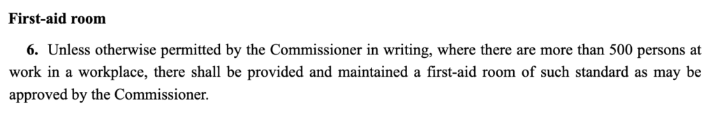 Under Workplace Safety and Health (First-Aid) Regulations section 6, a first aid room is legally required when the company has more than 500 persons at work, which includes contractors.